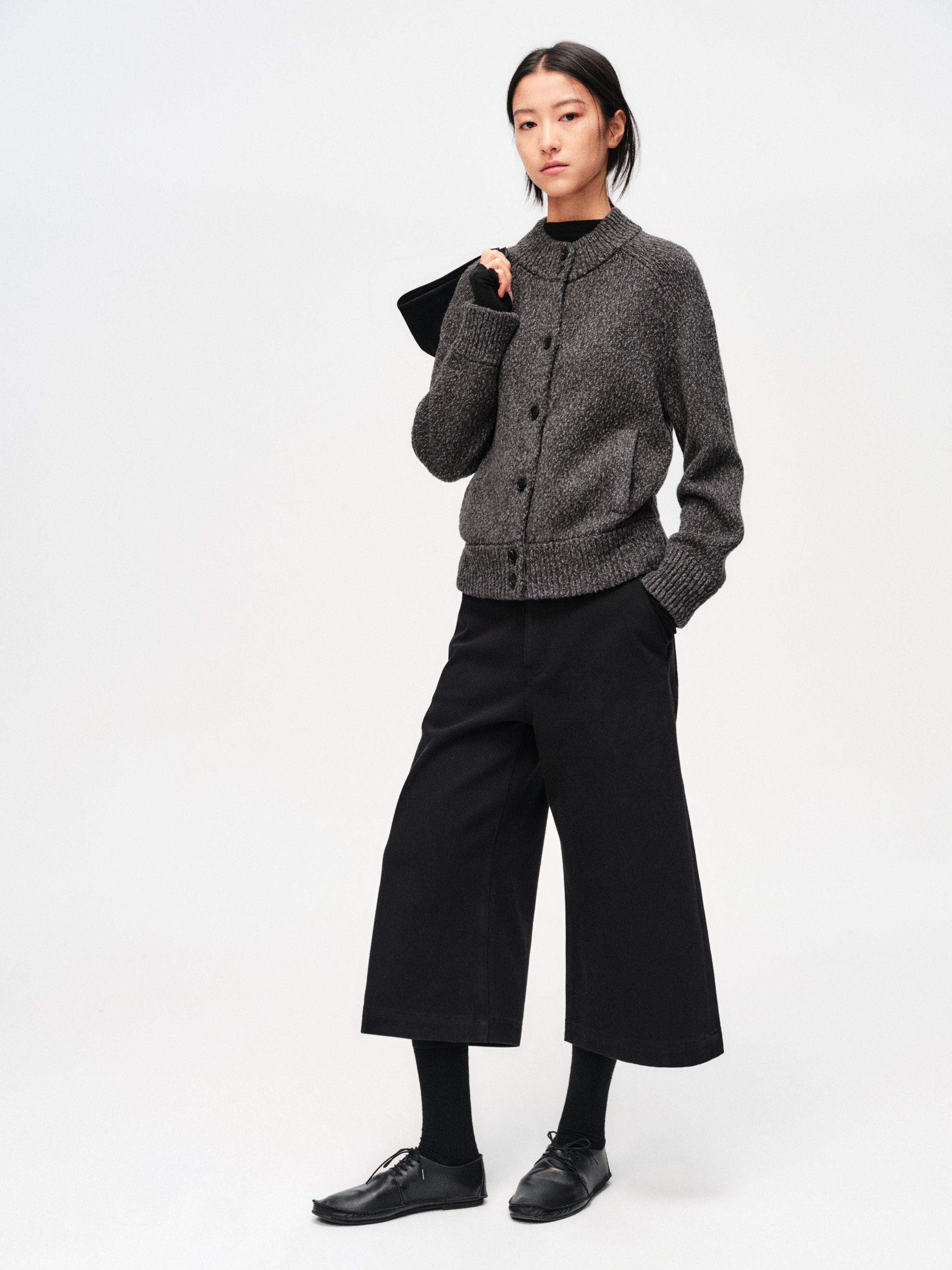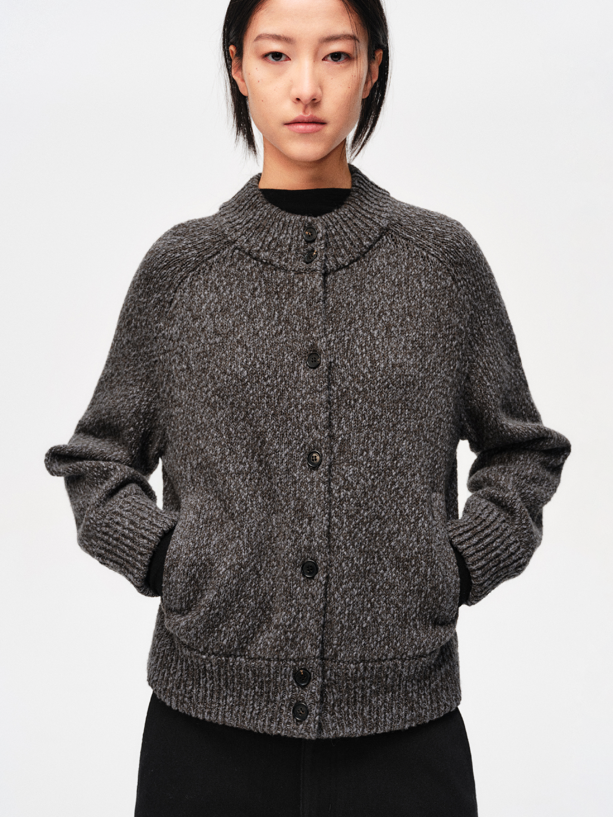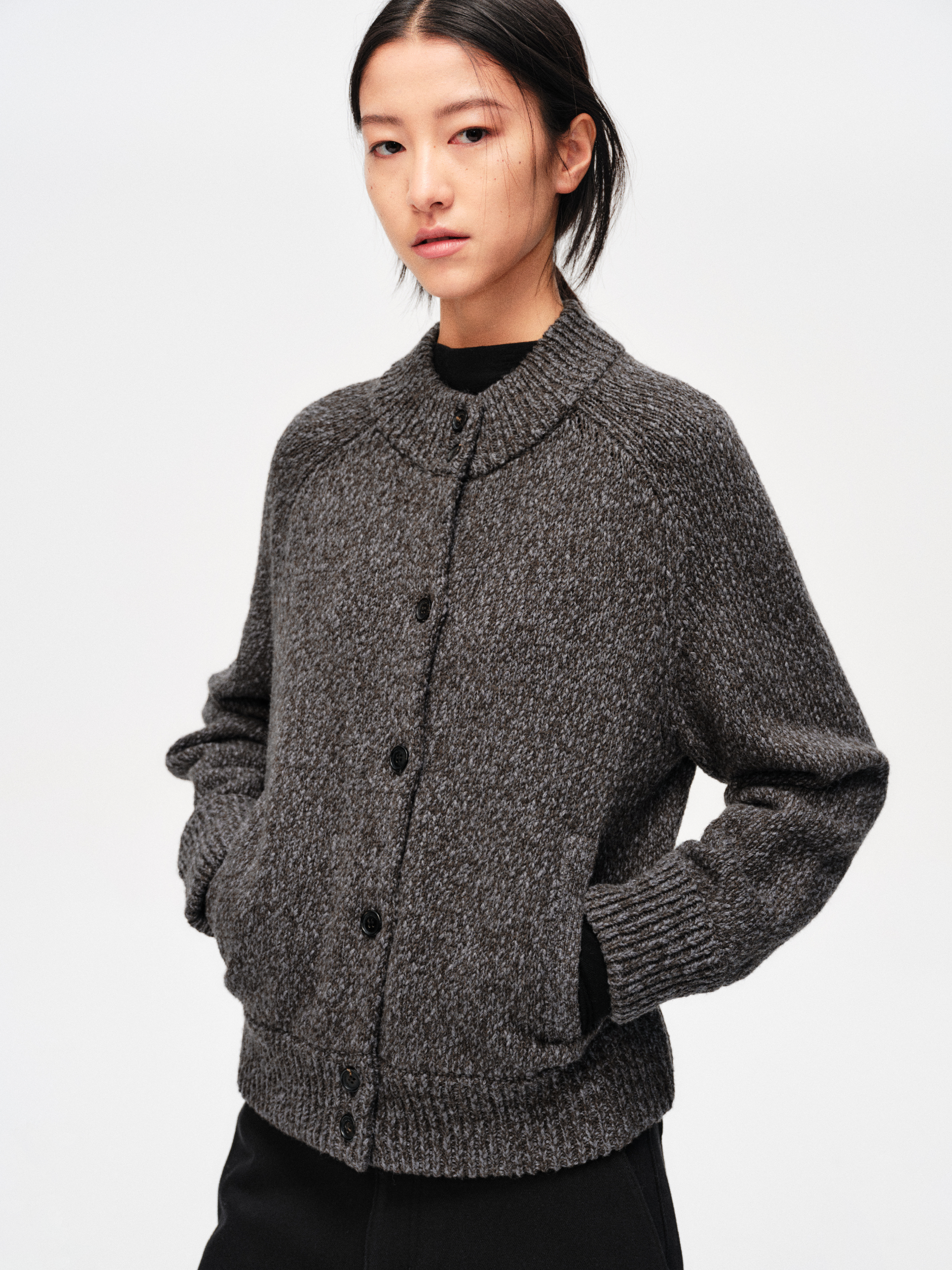 A vintage-inspired cardigan jacket knitted from a heathered cotton–wool blend. The yarn has a soft, airy loft and subtle texture, giving the piece an easy, lived-in feel. Cropped yet relaxed, it layers effortlessly over tees or shirts from early autumn through deep winter.