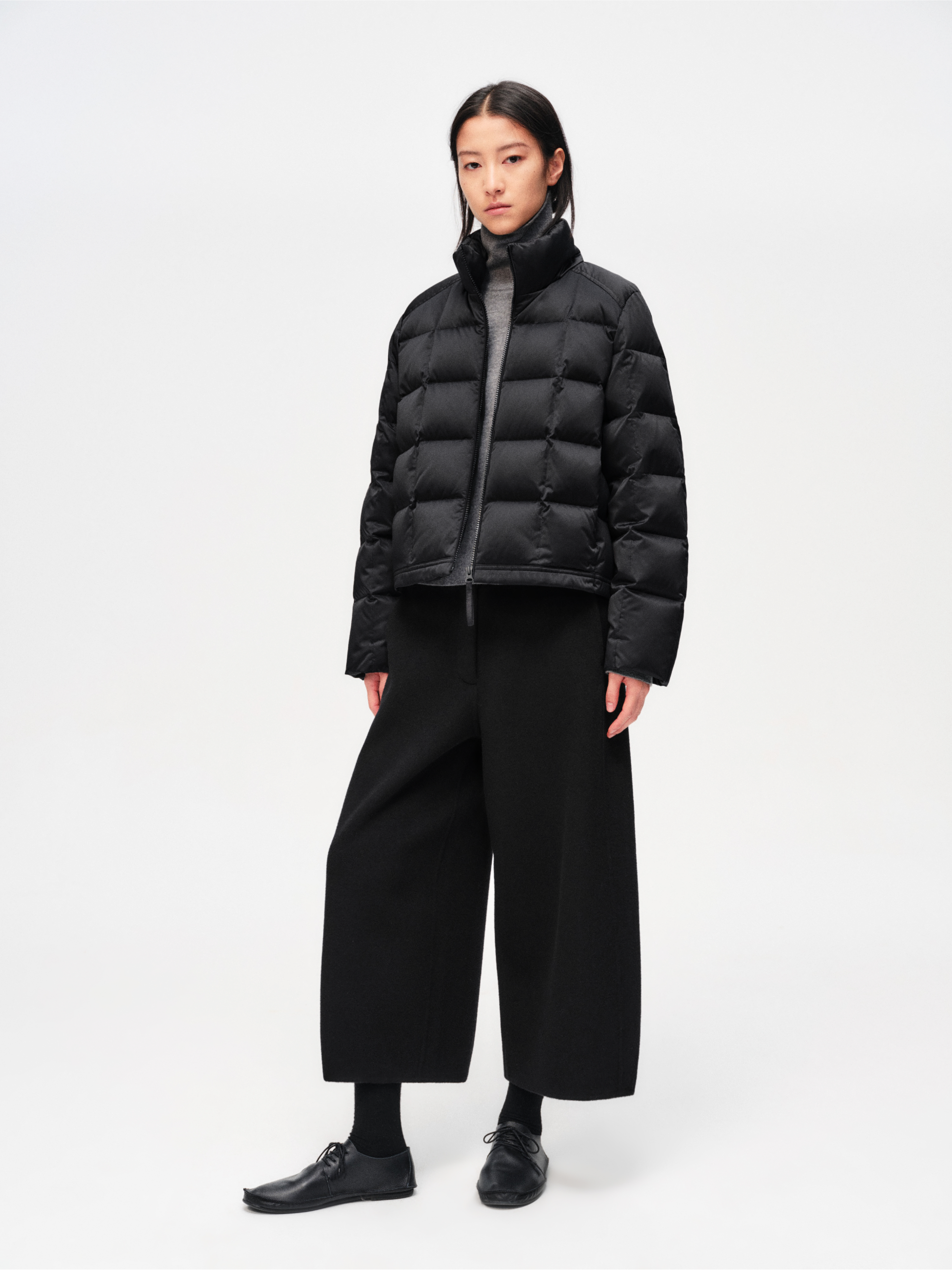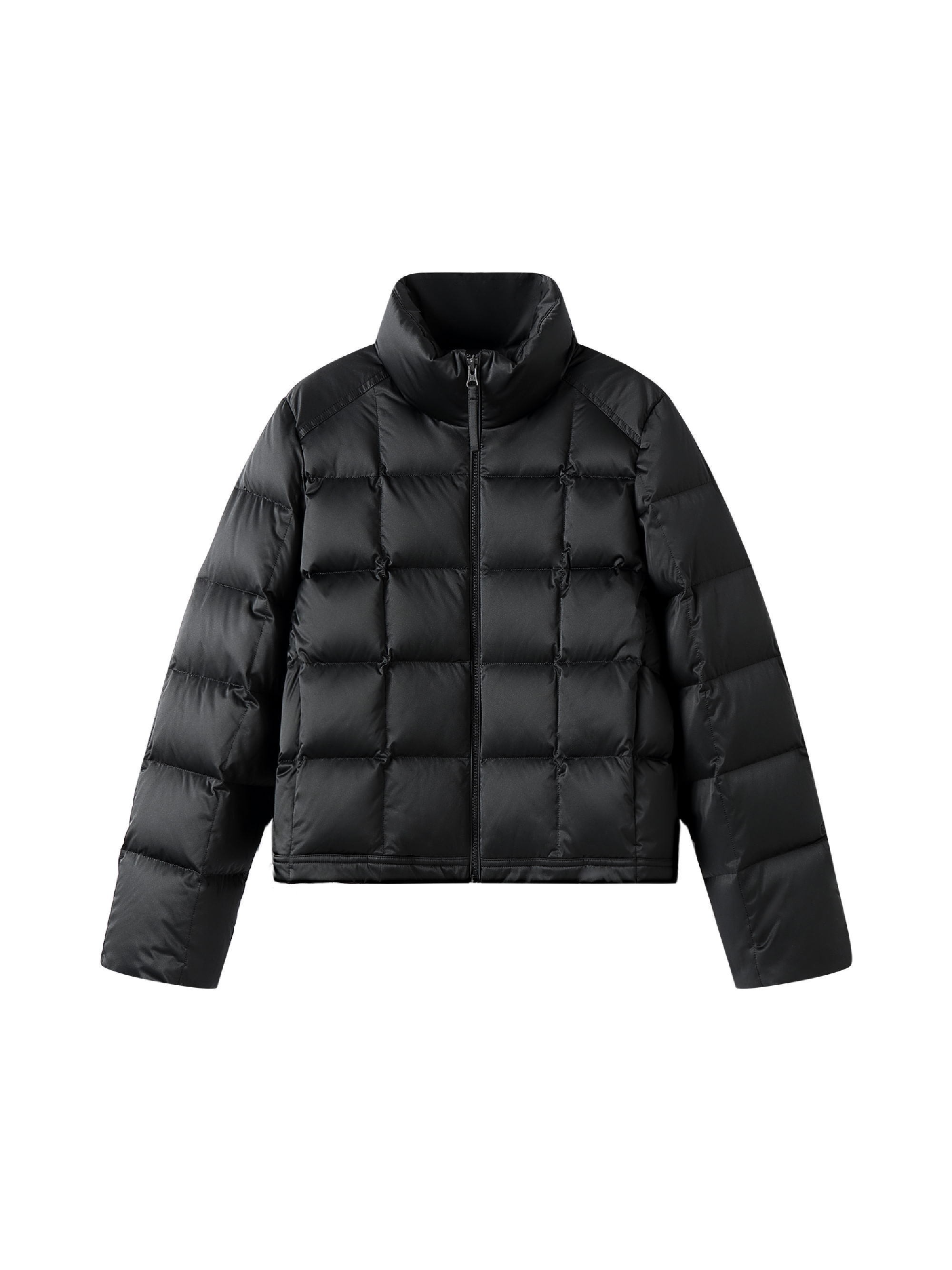 A luxurious satin-finish quilted down jacket crafted with a soft, lightweight shell that carries a gentle sheen. The fabric features a fine brushed twill texture with high-density anti-down construction, offering a full, structured handfeel. The reverse side is calender-finished for wind resistance, wrinkle resistance, and water repellency, while remaining smooth and easy to care for. Filled with premium 90% white goose down selected from free-range geese, this jacket delivers exceptional warmth with minimal weight—ideal for 5°C to –5°C winter conditions.