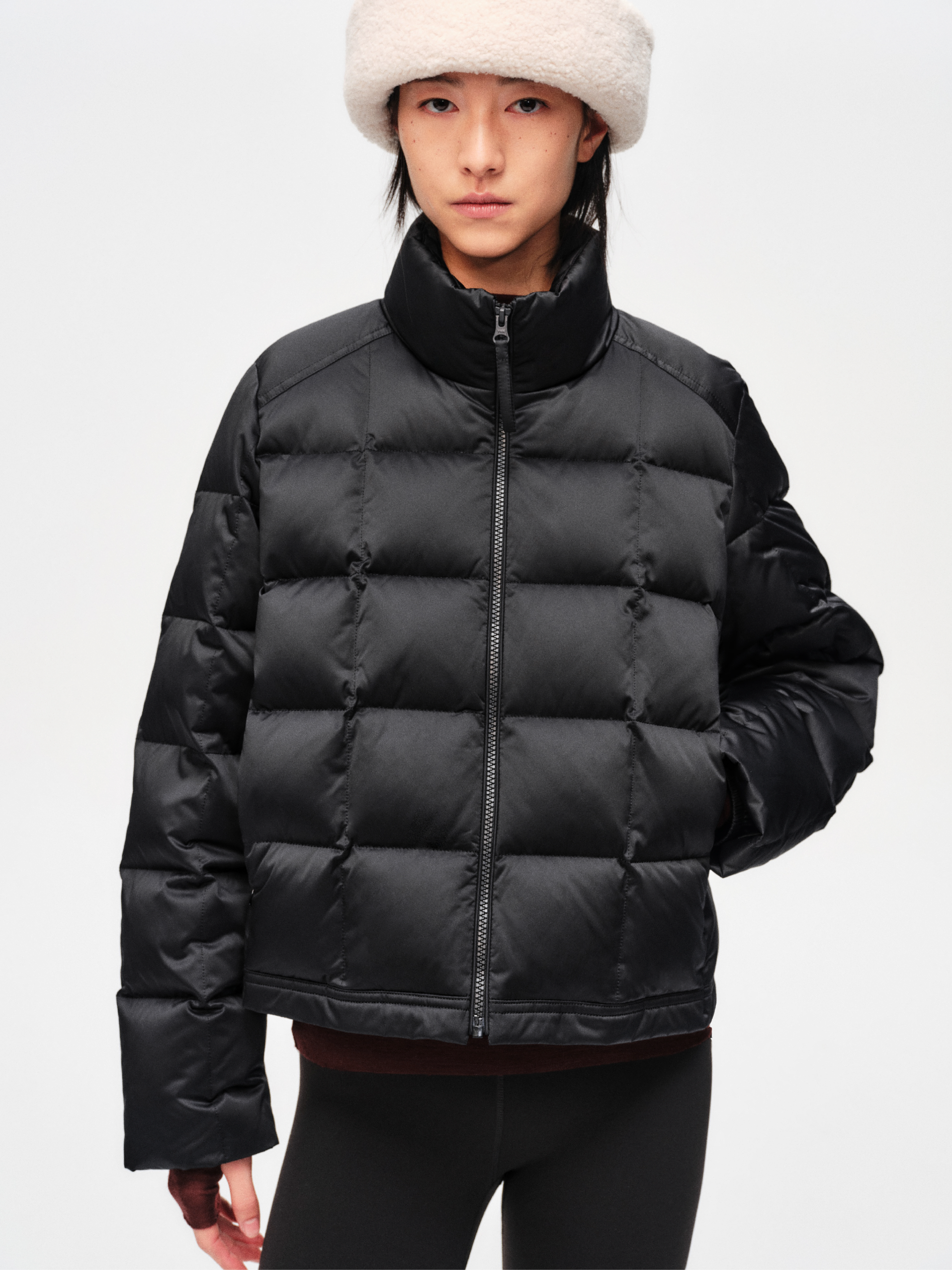 • Satin-touch quilted shell – Soft, glossy, lightweight fabric with a subtle brushed twill texture. High-density weave prevents down leakage while maintaining structure.