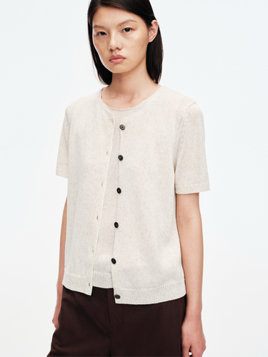 Made from RCS-certified yarns combining TENCEL™ Lyocell, cotton, paper-derived cellulose, nylon, and linen, this summer cardigan is airy, breathable, and subtly textured. The fabric features a dry, crisp hand feel with dimensional knitting and a natural slub from linen fibers.