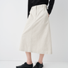 This A-line utility skirt is cut with a clean, structured silhouette that gently flares from the waist, creating a balanced and elongating profile. A rear inverted pleat introduces subtle volume and movement, adding dimensional structure while maintaining a composed, minimal aesthetic. The mid-length proportion enhances leg lines and offers everyday versatility.