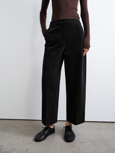 These cropped straight-leg trousers are tailored from fine-wale Pima cotton corduroy with a touch of stretch. Soft and structured with a subtle velvety sheen, they combine vintage appeal with modern ease. Ideal for smart layering and everyday comfort through the cooler seasons.