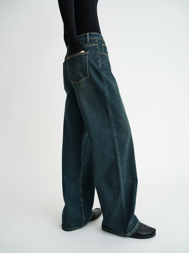 Each piece undergoes complex finishing techniques, including overdyeing, bleaching, hand-sanding, and monkey-wash treatments for depth and character.