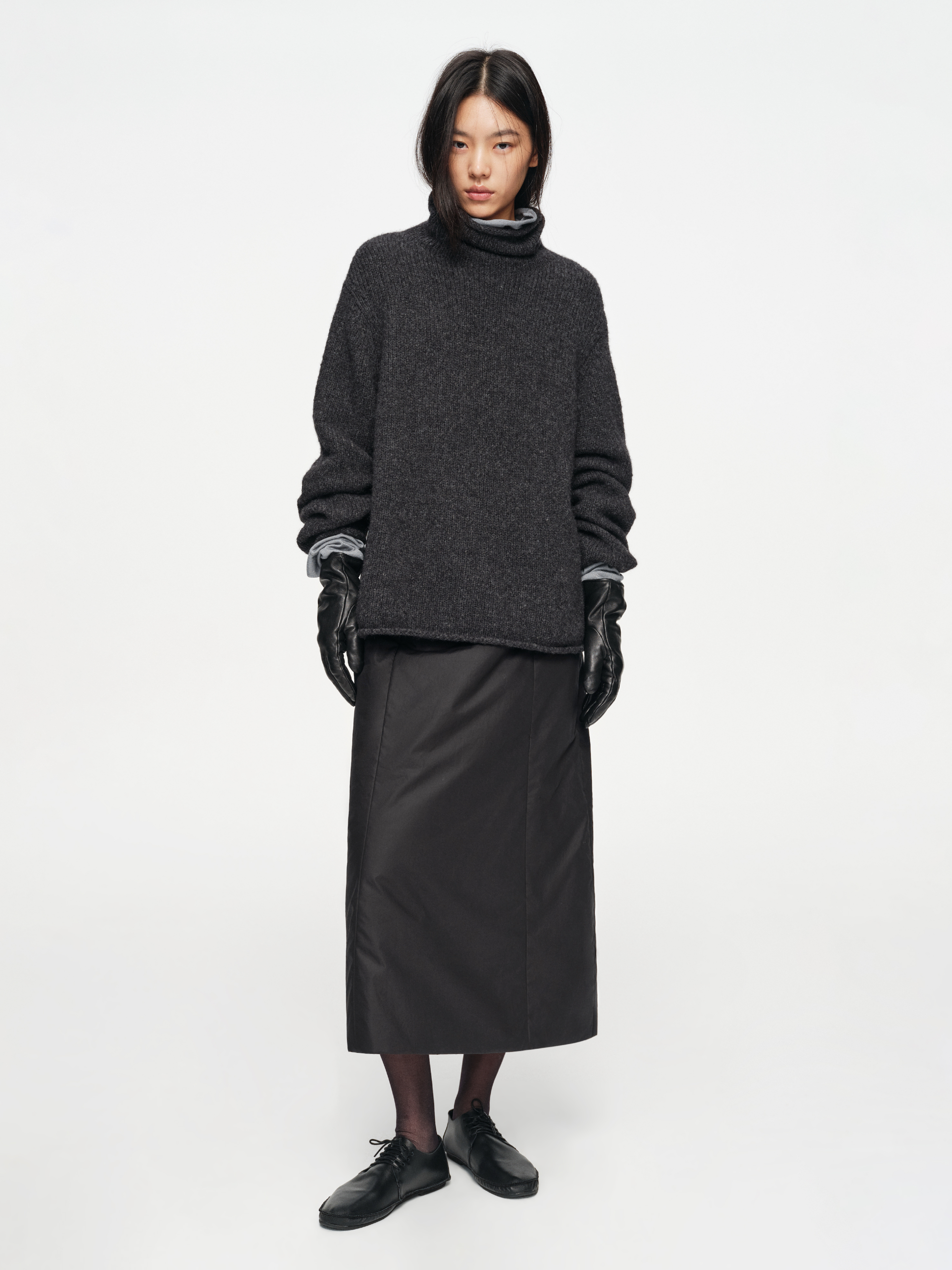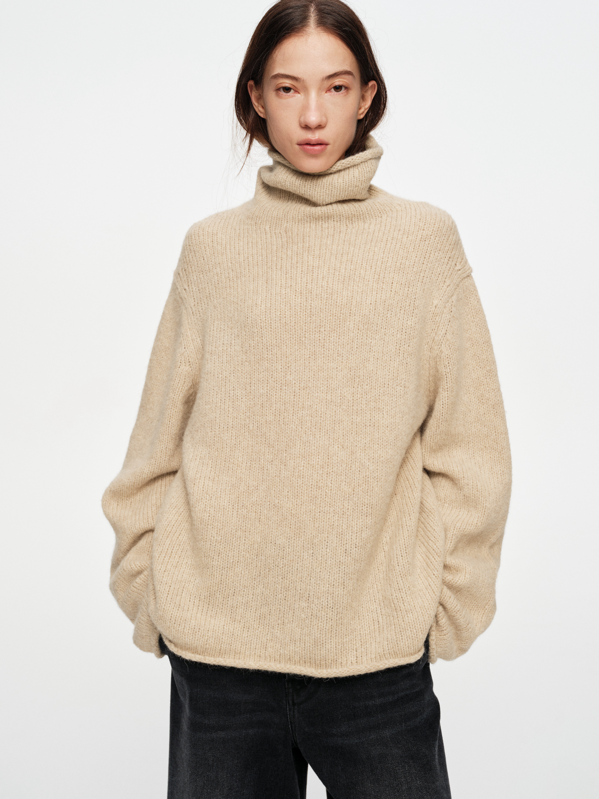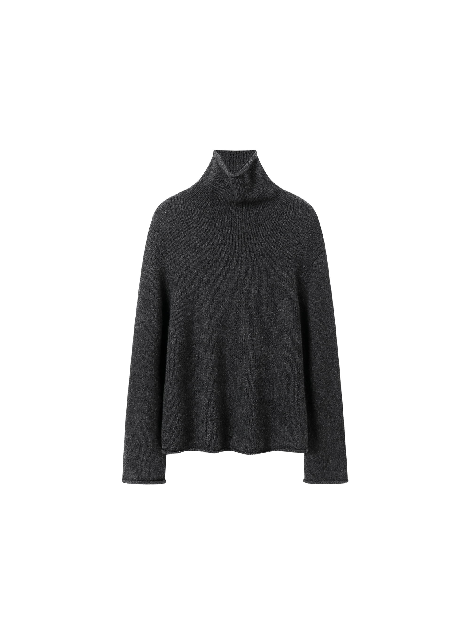 The relaxed, stacked neckline frames the face and provides versatile styling for winter layering.