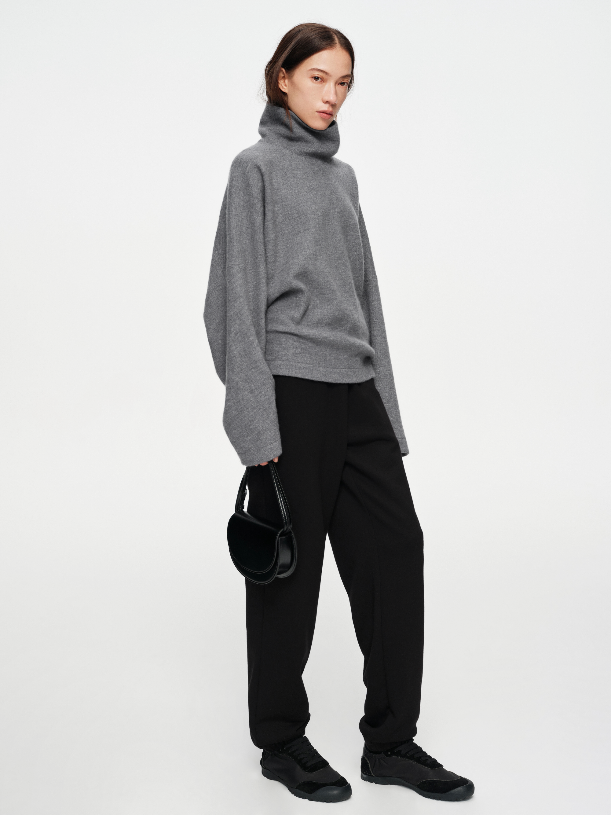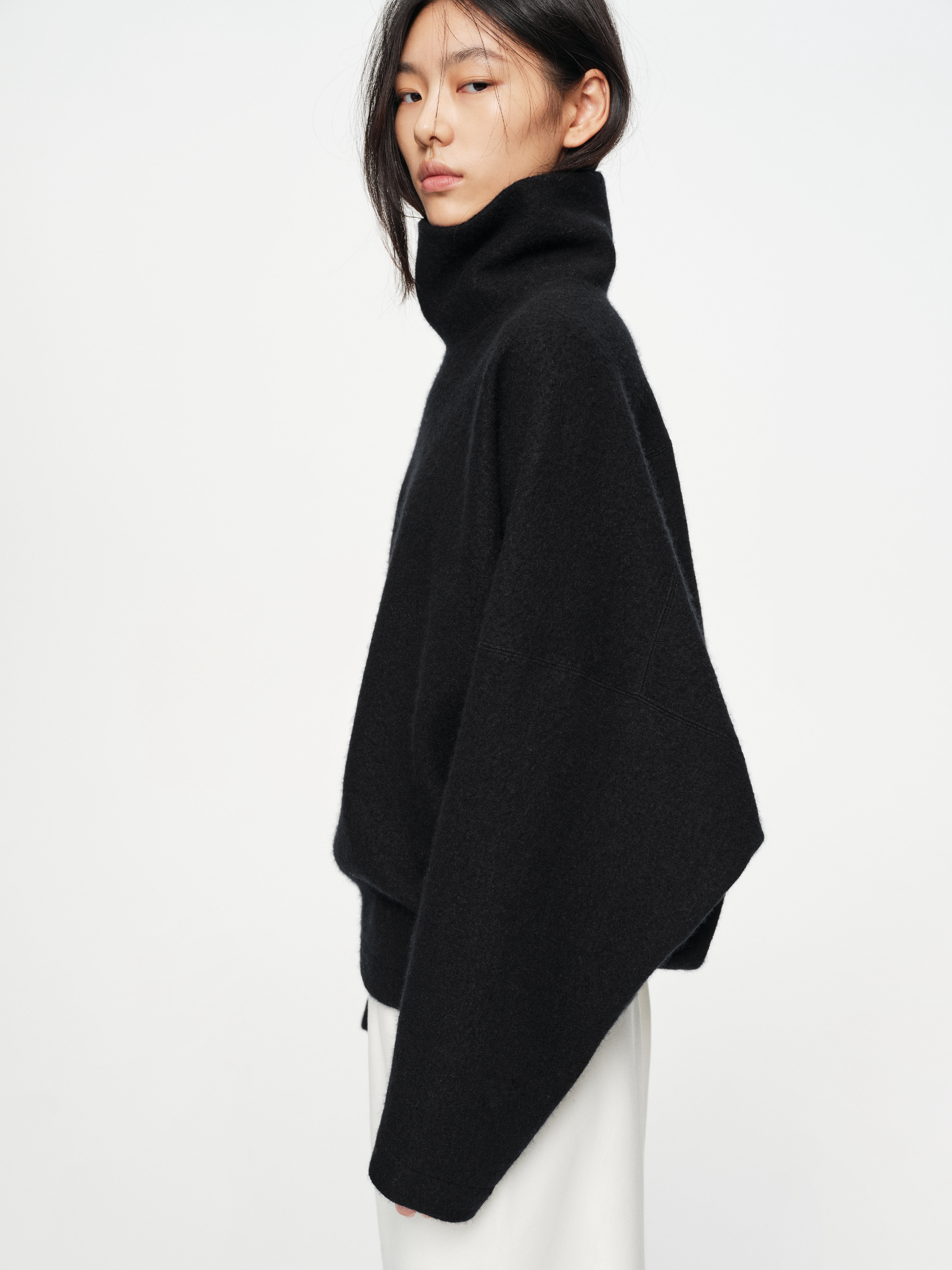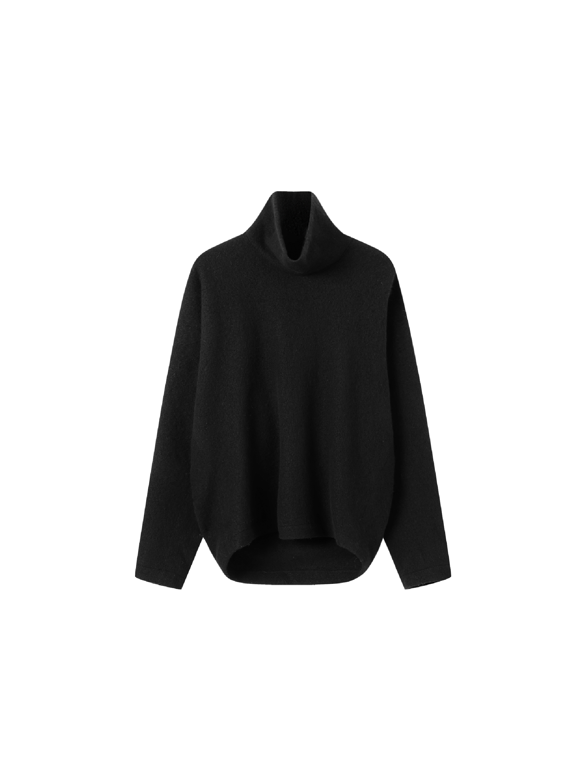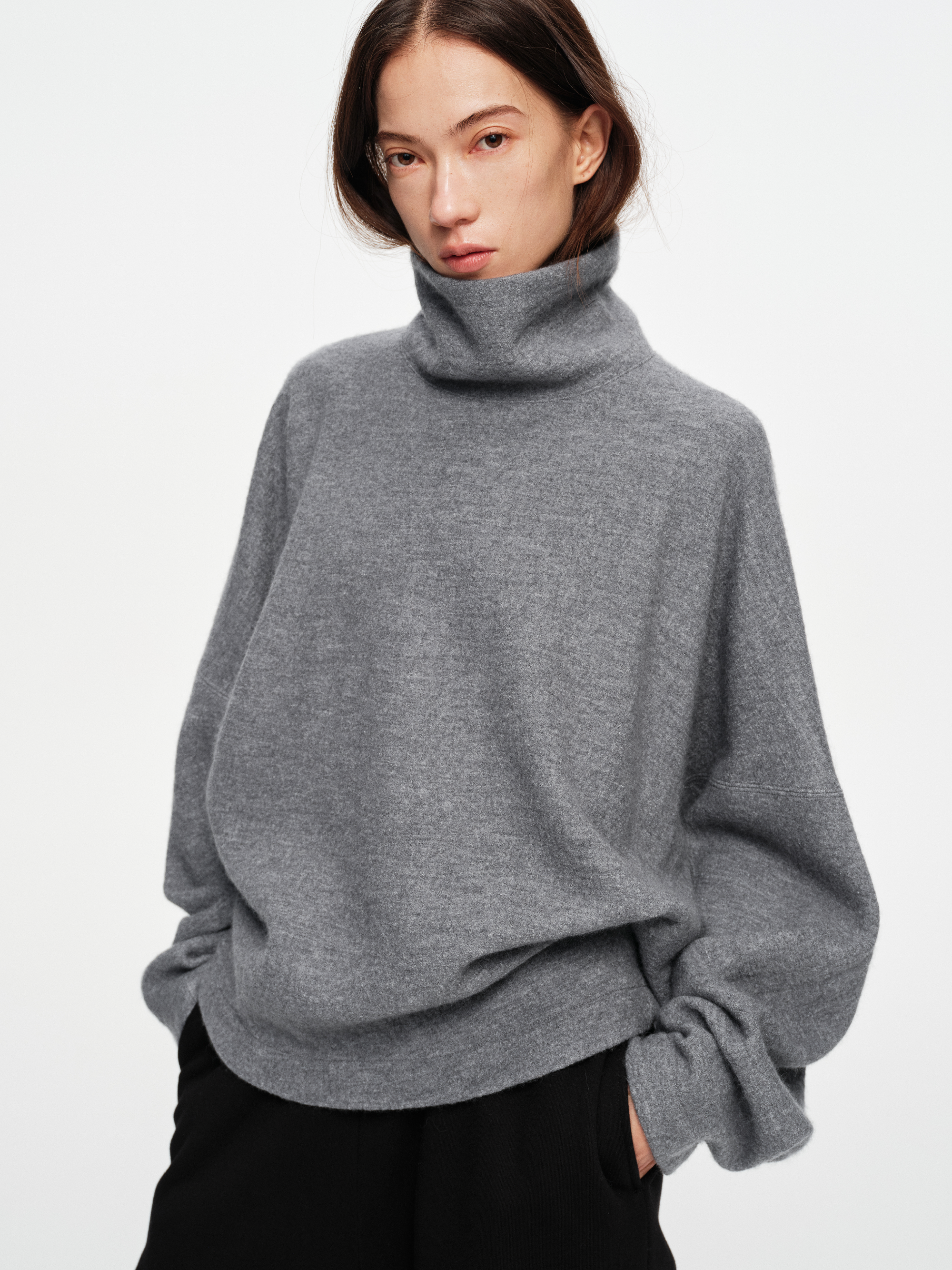 The wide, relaxed turtleneck offers exceptional comfort and can be styled with a soft draped effect.