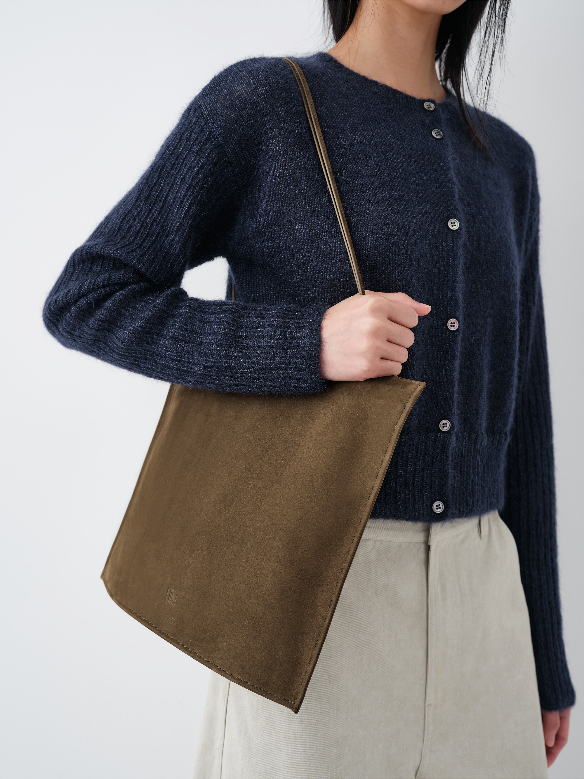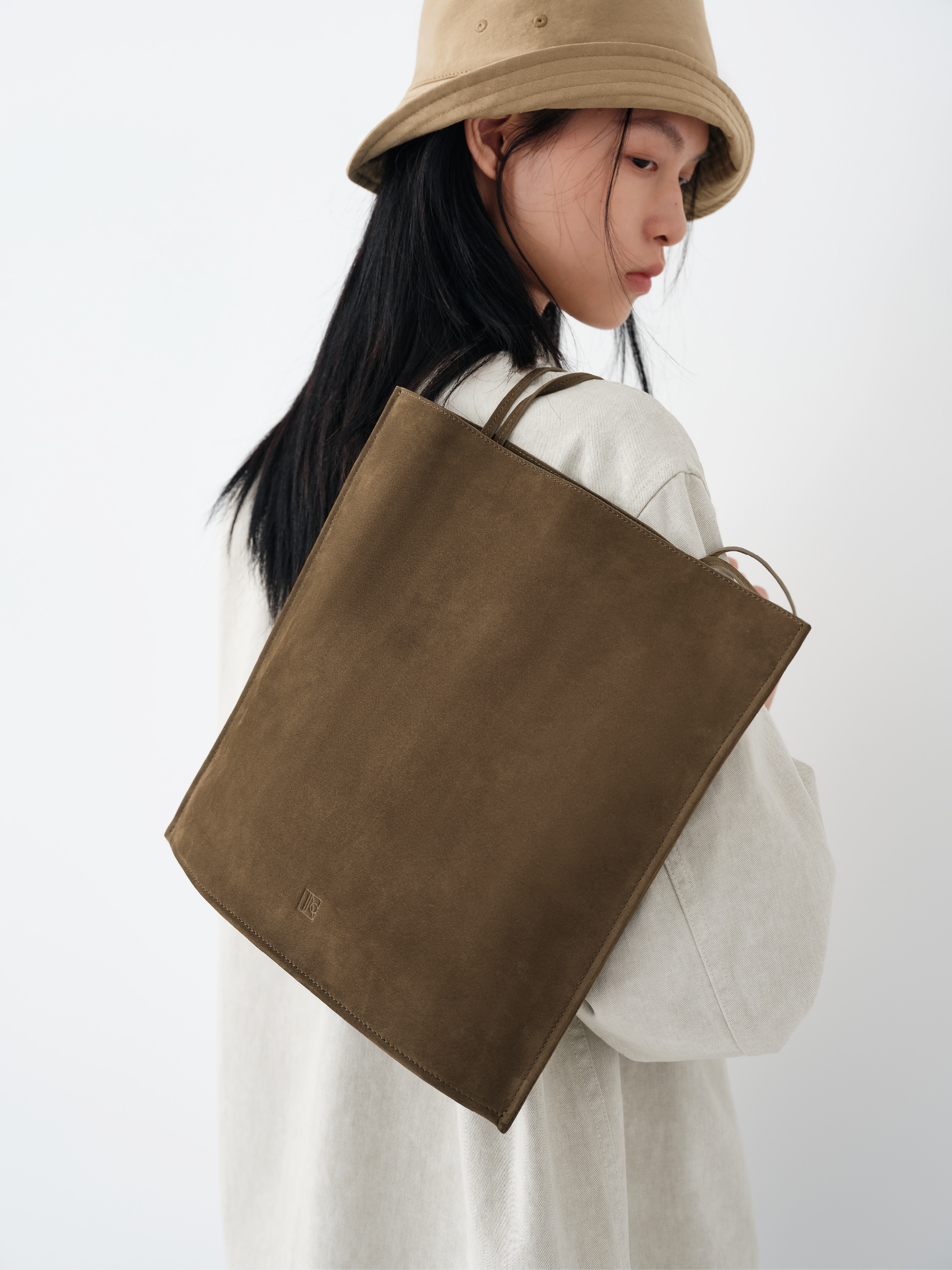 Made from matte-finished top-grain leather, the surface is specially embossed to form a fine, even texture before being gently buffed to reveal the natural fibers beneath. The result is a soft, supple hand feel with subtle elasticity and depth. The dye penetrates into the suede-like surface, producing a rich yet understated tone with a muted vintage character.