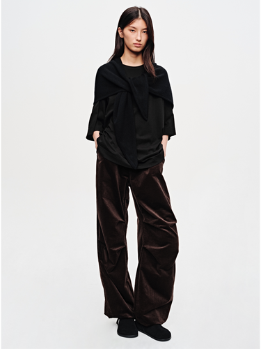 These wide-leg pants are crafted from Japanese Stylem fabric, featuring a 16-stripe cotton-feel corduroy. They have a medium-thick texture, offering both structure and elasticity for high comfort. The finely sheared fabric has full, three-dimensional ridges that naturally reflect a subtle sheen and provide moisture-absorbing and quick-drying properties. The detailed adjustable waistband design ensures a comfortable fit that accommodates various body shapes. The classic straight balloon pant style features double pleats for a relaxed yet stylish look. The full-length design is complemented by adjustable cuffs for a relaxed feel.