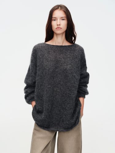 Spun from a certified South African mohair blend, this sweater pairs plush volume with refined lightness. Designed with a wide neckline and soft dropped shoulders, it drapes elegantly while showcasing the natural luster and airiness of its brushed texture. The loosely knitted structure enhances breathability while maintaining warmth.