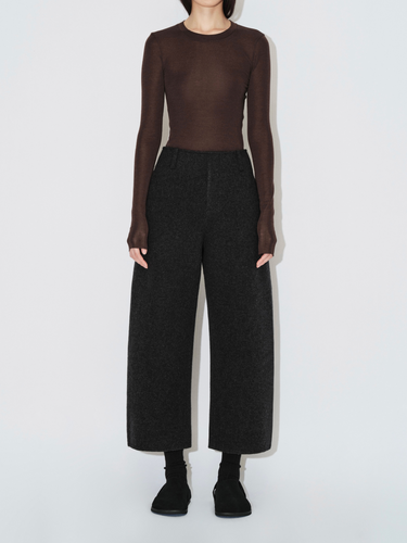 The top has an H-shaped, fitted crop silhouette with a vintage-inspired design. The combination of tailored cuts and frayed edges creates a slimming effect and adds a fashionable, versatile look. The stacked sleeve design creates a naturally layered appearance, visually elongating the proportions and offering a stylish, relaxed feel. The high neck with a naturally stacked design and casual crew neckline smooths and complements the neck, enhancing the classic style.