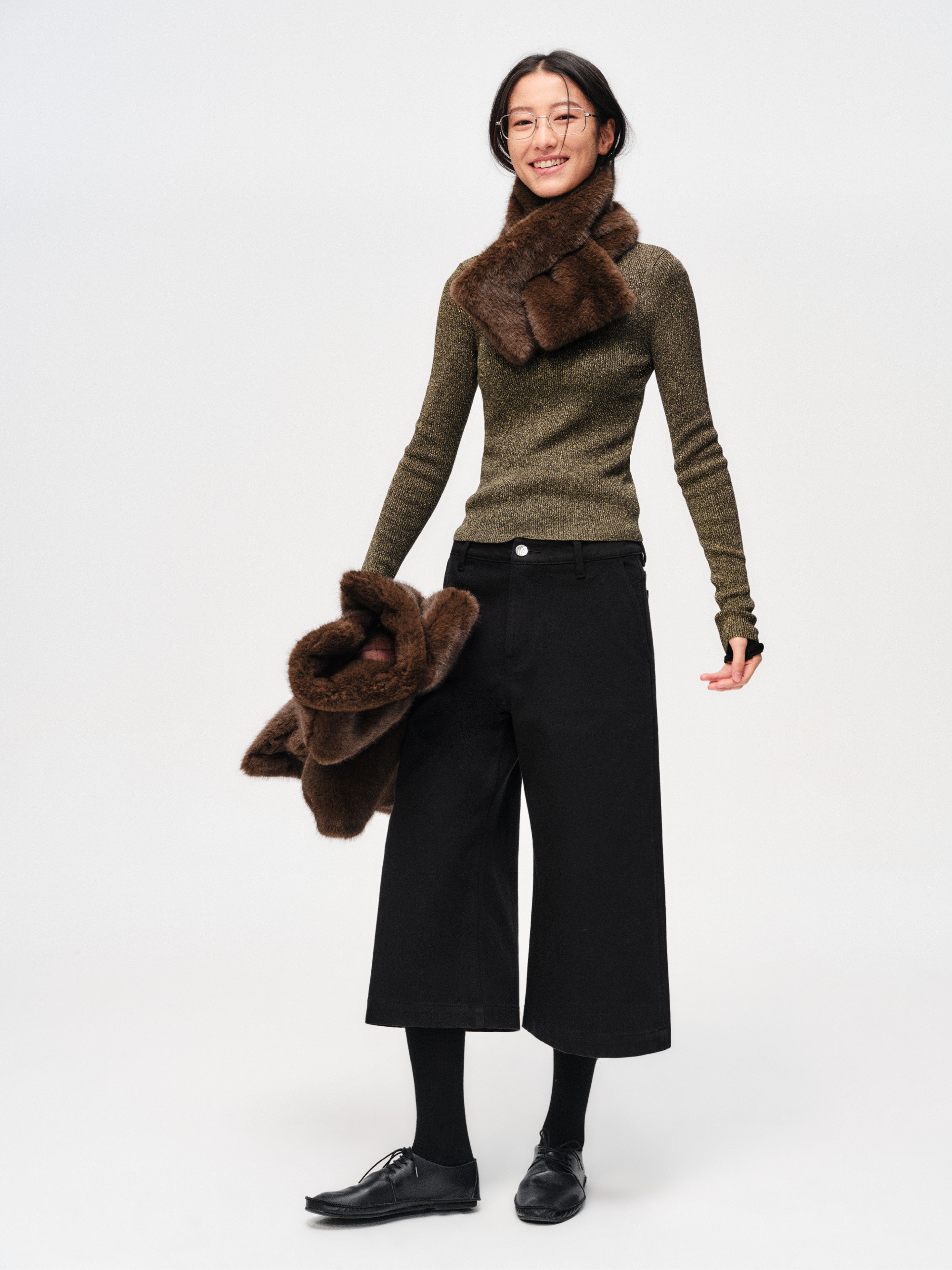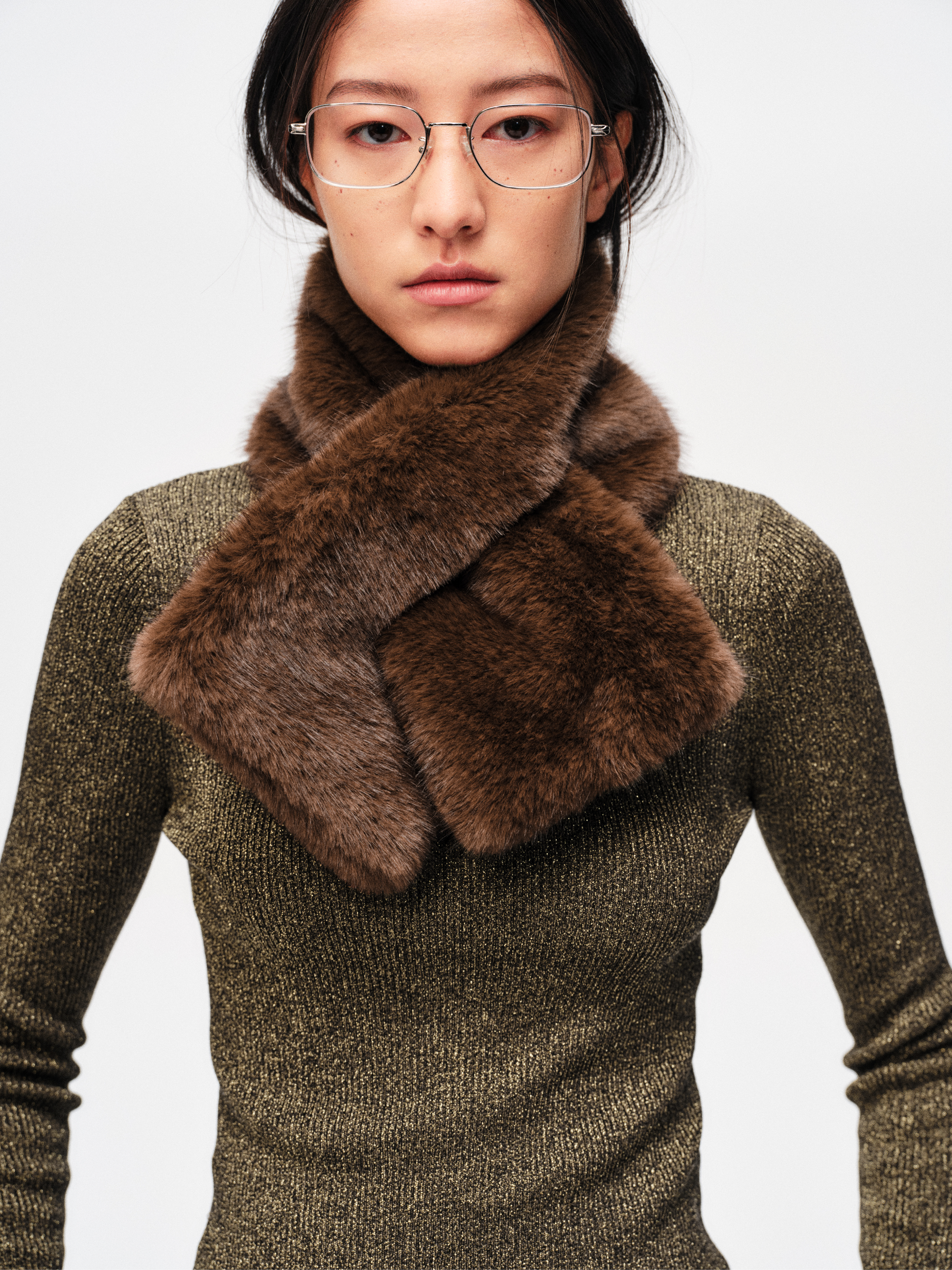 A plush faux-fur neck warmer crafted from eco-friendly fibers. The pile is soft, lightweight, and naturally lustrous, with a rich, dimensional texture created by combining dyed-tip techniques and varied fiber lengths. Cozy yet refined, it adds warmth and a gentle winter mood to any outfit while remaining easy to care for and comfortable against the skin.