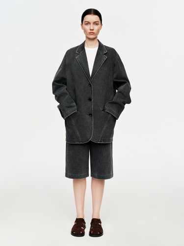 This set is made from carefully selected high-quality pure cotton heavyweight twill fabric. The fabric features a rugged, vintage texture and has a fine, crisp handfeel. Stone-washed for an aged look, it is soft yet maintains a structured feel. The blazer has a wide, straight cut with a comfortable, slightly dropped shoulder, offering a relaxed, natural fit. The narrow, single-breasted buttons and the downward-pointing flat lapel break away from the traditional, dull suit collar style. The garment features three-dimensional topstitching, adding depth and structure to the design. Vertical dividing lines and three-dimensional topstitching further enrich the garment's structural layers. The trousers are finely tailored straight-leg pants that enhance the body’s proportions, effortlessly creating a light retro denim look with a nod to classic denim style.