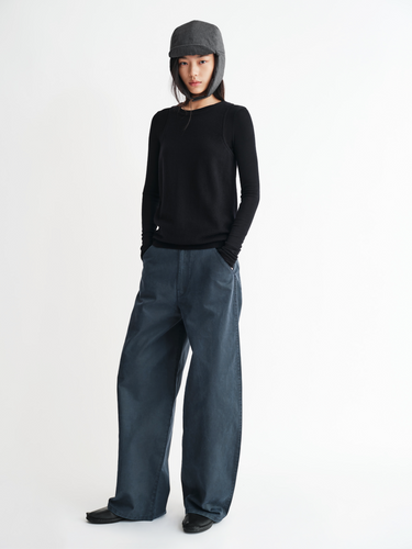 A clean round neckline and slightly curved shoulder cut highlight the shoulder line and neck contours, creating a relaxed yet refined silhouette.