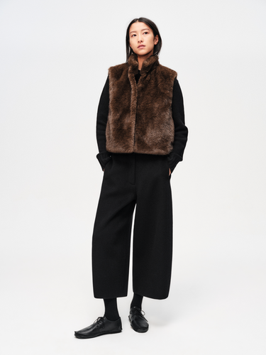 A lightweight faux-fur padded vest crafted from eco-friendly fibers. The pile is airy, plush, and smooth with a natural luster, while the unique blend of dyed tips and varied fiber lengths creates rich dimension and a texture reminiscent of genuine fur. Filled with 3M™ G-type high-loft thermal insulation, the vest offers warmth without weight, making it ideal for crisp autumn days and deep-winter layering.