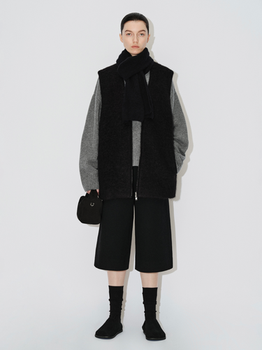 This vest jacket is made from ultra-fine Peruvian alpaca wool blend, with fibers that are long and soft. The brushing process gives it a skin-friendly, smooth, and soft texture, while the rich, glossy color enhances its visual appeal. The interior lining is made of Japanese Bemberg copper ammonia fiber, offering a soft satin-like sheen and lightweight, delicate touch, with a natural drape. The garment is lightweight yet offers excellent warmth. The minimalist low V-neck design adds a relaxed style, accentuating the shoulder and neck lines. The invisible side pockets with 3D stitching design enrich the garment’s detail, and the double-opening metal zipper allows for easy wear and a versatile look.