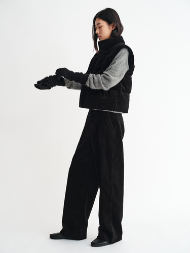 This city-inspired down vest is crafted from 100% cotton corduroy, processed with a post-wash finish to achieve a breathable, structured texture and a naturally vintage look. Filled with premium 90% white goose down, it offers exceptional warmth and featherlight comfort. The fabric features a soft brushed handfeel and a subtle sheen, while the inner lining is made of cozy brushed knit for enhanced comfort.