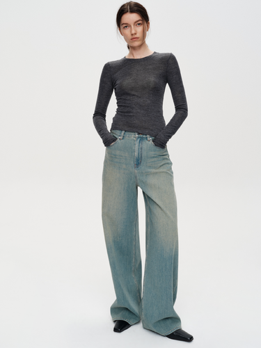 The top has an H-shaped, fitted crop silhouette with a vintage-inspired design. The combination of tailored cuts and frayed edges creates a slimming effect and adds a fashionable, versatile look. The stacked sleeve design creates a naturally layered appearance, visually elongating the proportions and offering a stylish, relaxed feel. The high neck with a naturally stacked design and casual crew neckline smooths and complements the neck, enhancing the classic style.