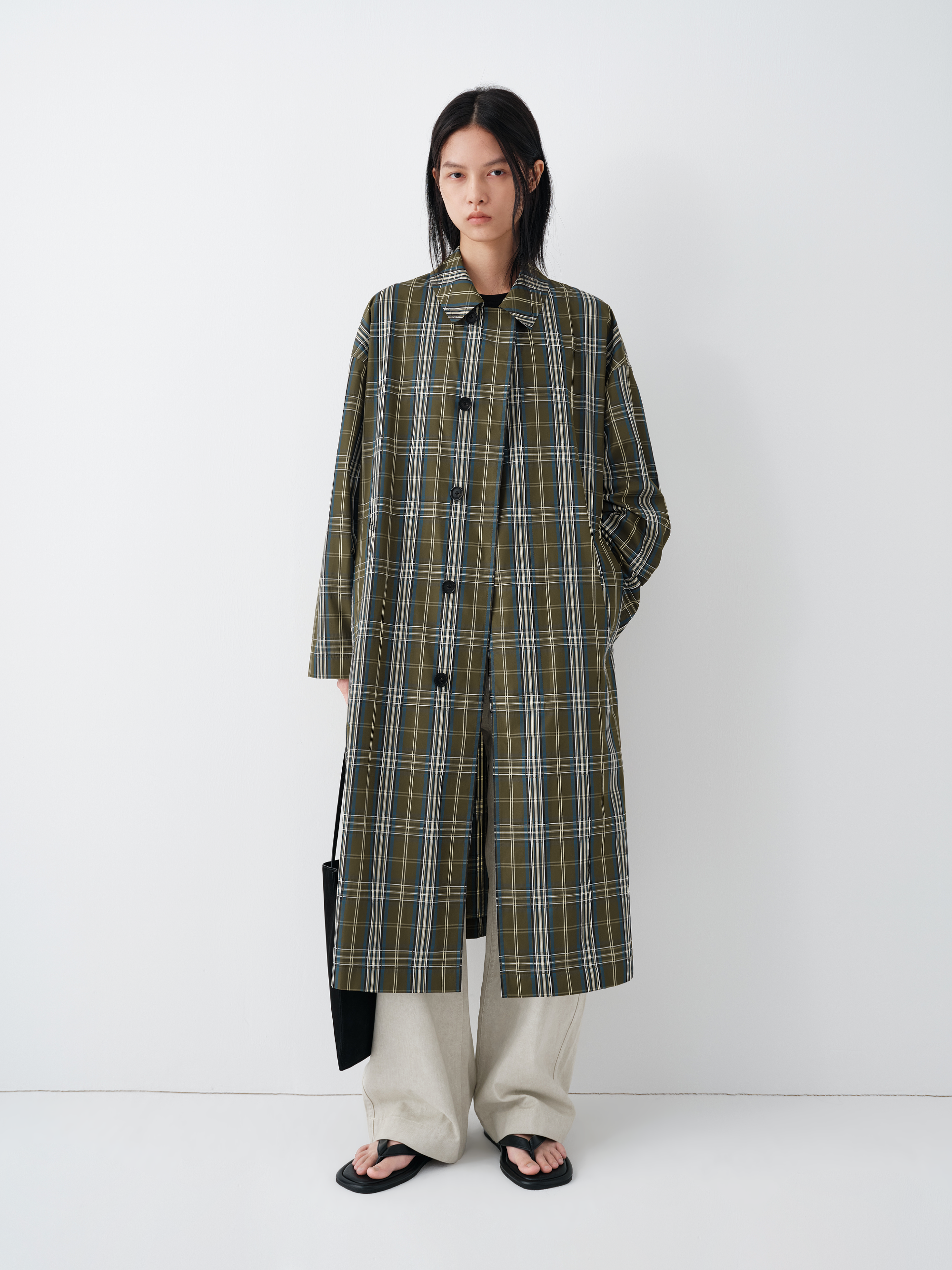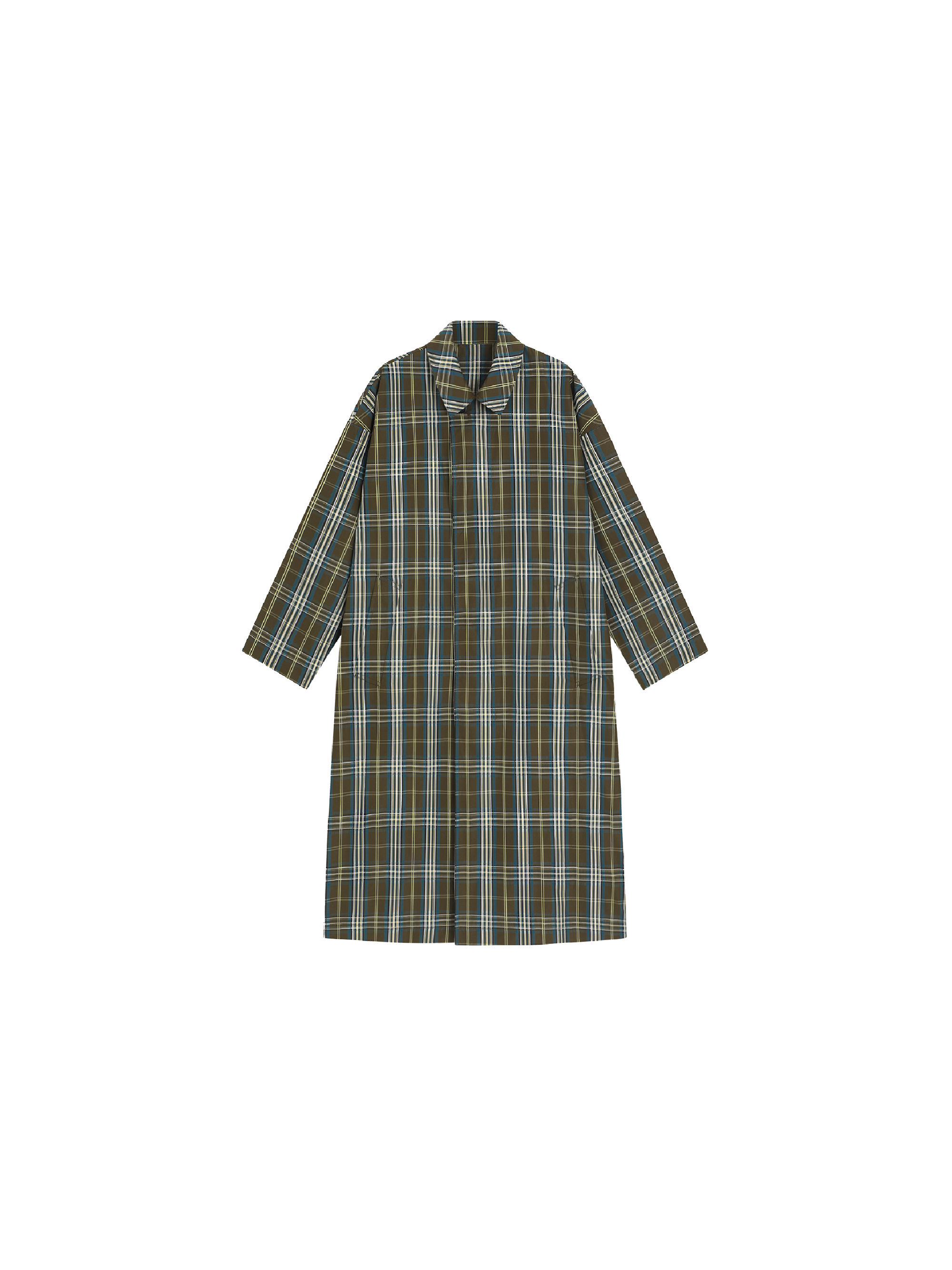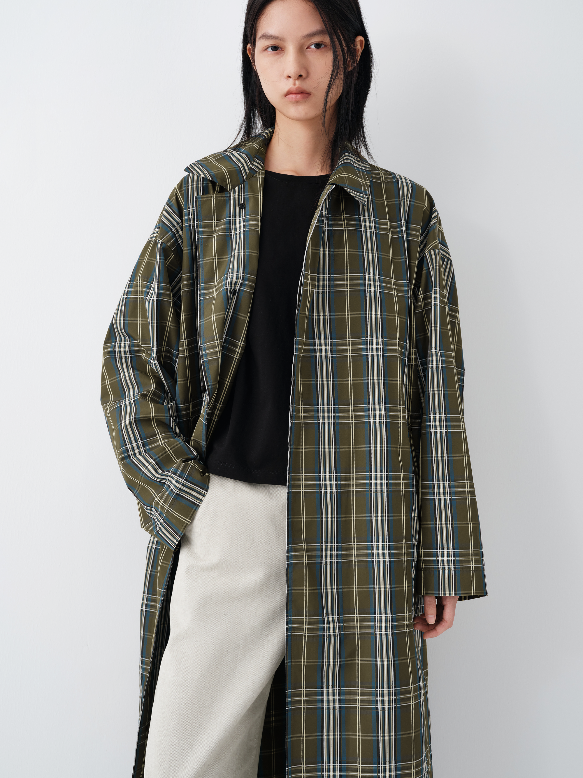 This lightweight plaid trench coat draws inspiration from classic Scottish tartan, combining everyday practicality with a refined, modern sensibility. The color-woven texture creates subtle tonal contrast within the plaid, adding depth and dimension while maintaining a clean, composed look.
