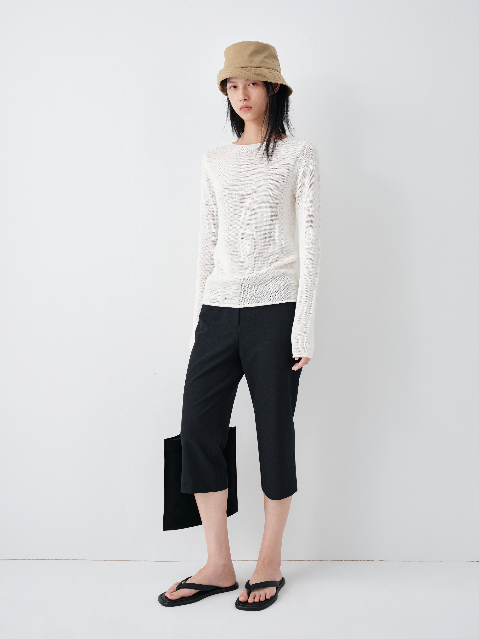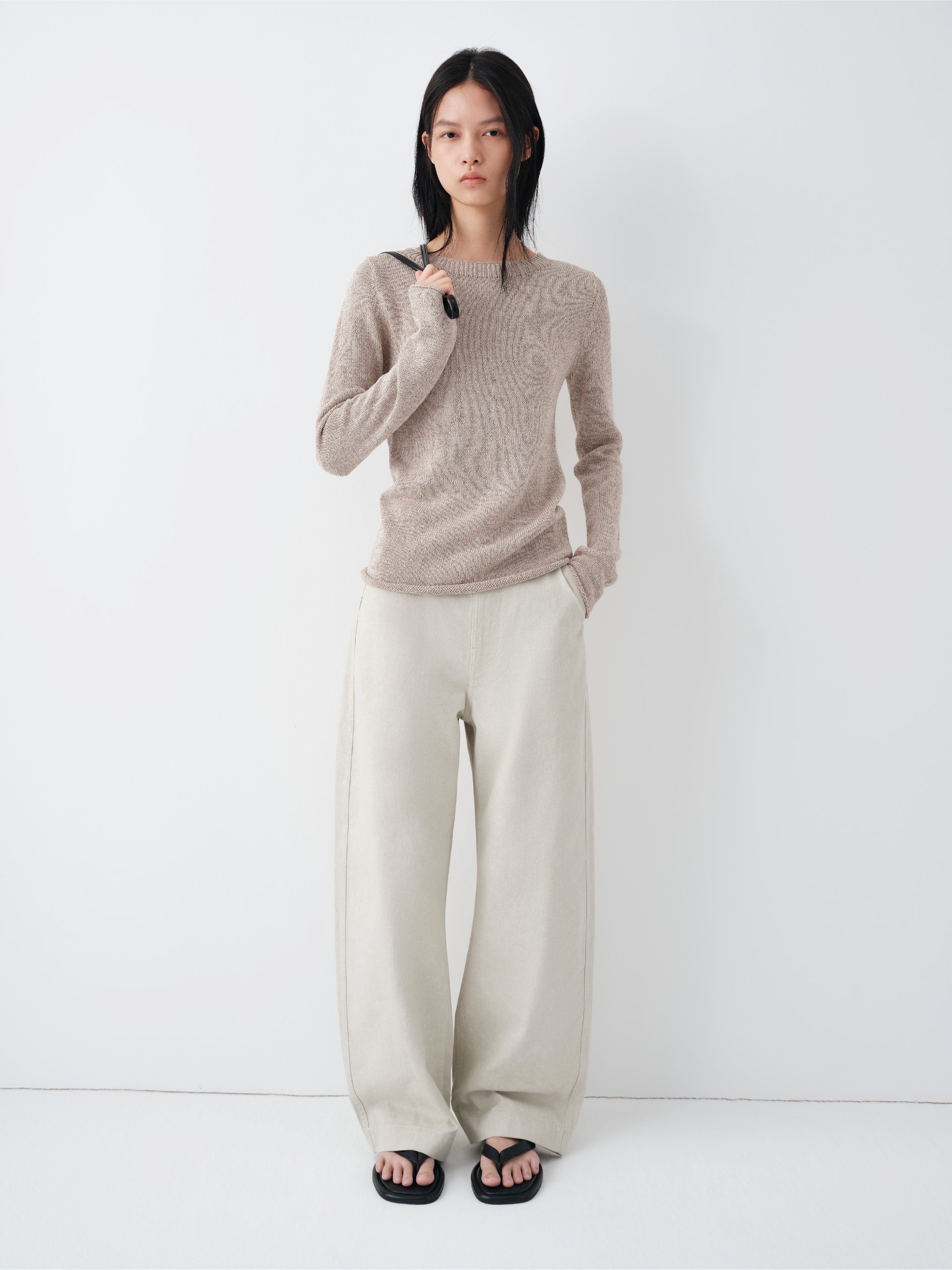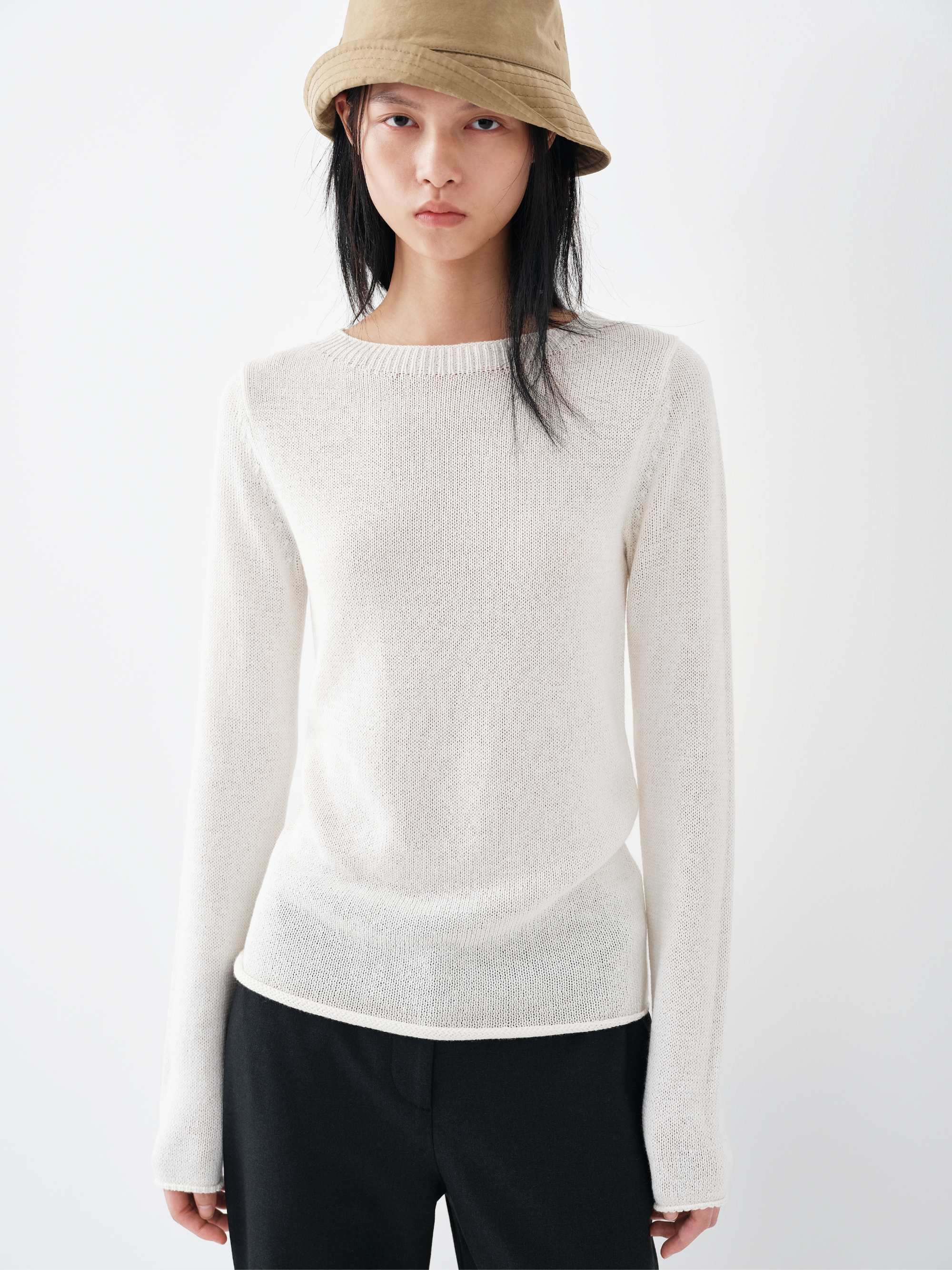 Crafted from a textured cotton-linen blend yarn enriched with silk and cashmere, the fabric balances breathability with softness. The slightly rustic spun texture gives the surface a youthful, tactile character, while silk introduces a gentle sheen and smoothness. Cashmere enhances warmth and resilience, resulting in a knit that feels dry yet refined against the skin.