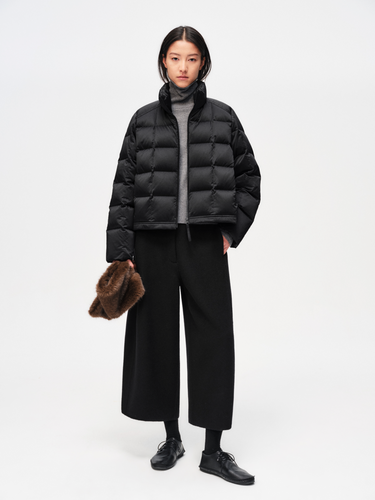 A luxurious satin-finish quilted down jacket crafted with a soft, lightweight shell that carries a gentle sheen. The fabric features a fine brushed twill texture with high-density anti-down construction, offering a full, structured handfeel. The reverse side is calender-finished for wind resistance, wrinkle resistance, and water repellency, while remaining smooth and easy to care for. Filled with premium 90% white goose down selected from free-range geese, this jacket delivers exceptional warmth with minimal weight—ideal for 5°C to –5°C winter conditions.