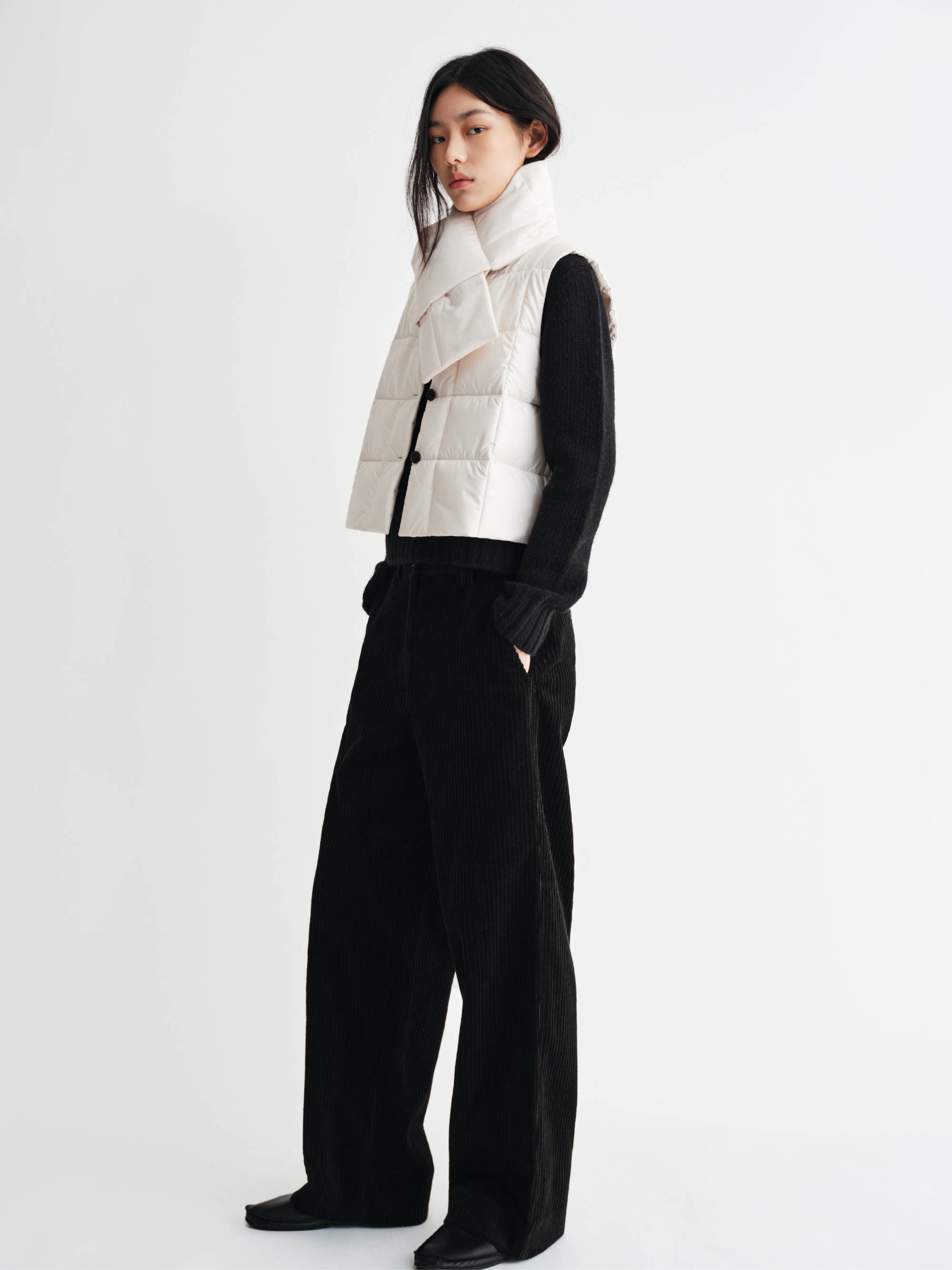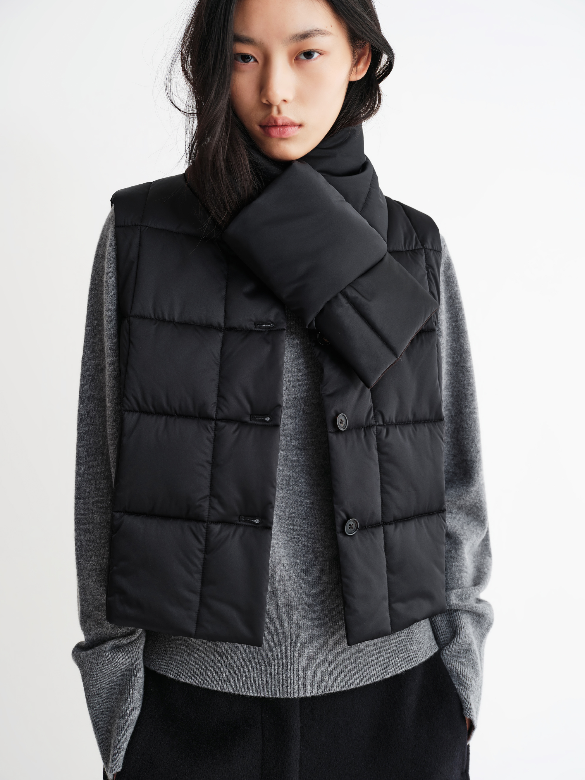 The vest offers a clean boxy cropped fit for easy layering across seasons, and the scarf provides a soft, cloud-like wrap with a subtle sheen. Together, they deliver lightweight warmth and understated functionality—ideal for urban winter dressing.