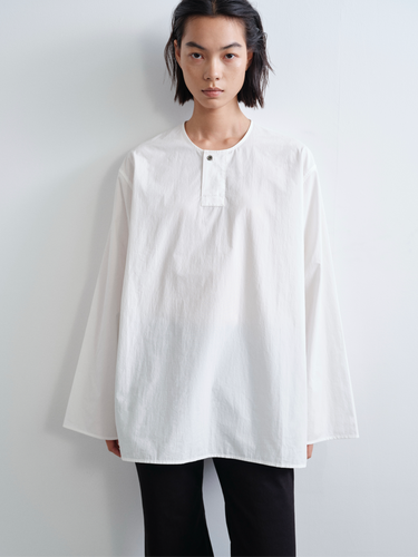 Crafted from high-twist long-staple cotton, this henley shirt features a relaxed silhouette with a soft crinkled texture. The retro round neckline and half placket, paired with a single natural black mother-of-pearl button, bring a casual refinement to a workwear-inspired essential.