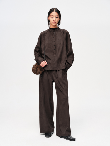 A coordinated set crafted from eco-conscious faux suede, featuring a soft, velvety surface with a refined matte sheen. Lightweight yet structured, the fabric offers gentle warmth, breathability, and strong wrinkle resistance—ideal for multi-season wear. The relaxed silhouette, paired with vintage-inspired details, creates an effortless and composed autumn–winter look.